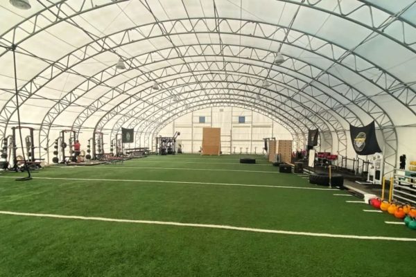 - Duże rozpiętości – do 60–80 m (200–260 stóp) bez słupów wewnętrznych, idealne dla pełnowymiarowych boisk halowych.