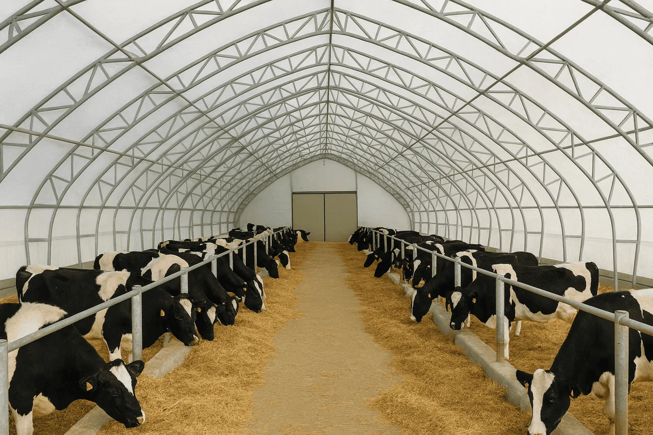 Nowoczesne obory kryte tkaniną to niezawodne rozwiązanie zapewniające komfort i ochronę przed czynnikami atmosferycznymi. Konstrukcje te pomagają utrzymać optymalne warunki w oborze dla bydła, owiec, kóz, trzody chlewnej i drobiu, jednocześnie obniżając koszty budowy i eksploatacji. Dzięki swojej wszechstronności, obory kryte tkaniną nadają się zarówno do małych gospodarstw rodzinnych, jak i dużych gospodarstw hodowlanych, a ponadto można je łatwo skalować, aby szybko reagować na zmieniającą się wielkość stada i potrzeby w zakresie utrzymania.