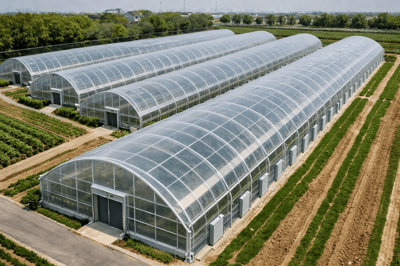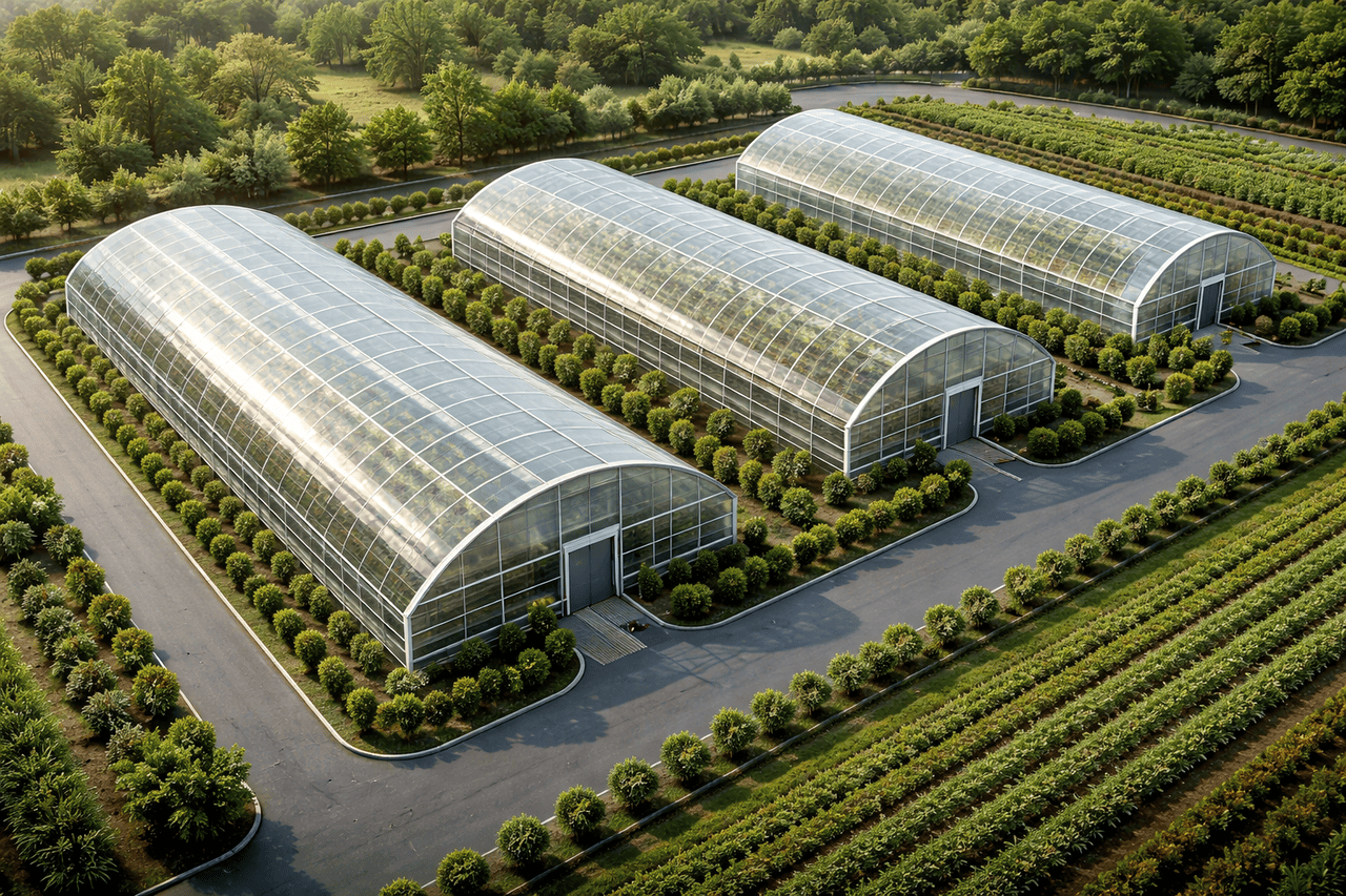 - Szklarnie komercyjne do całorocznej produkcji warzyw (pomidory, ogórki, papryka i inne).